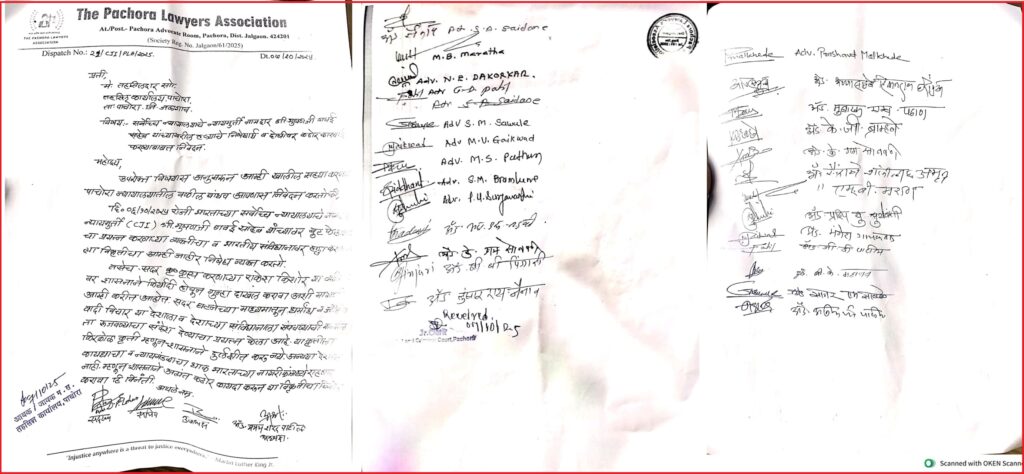 पाचोरा न्यायालयातील वकील बांधवांनी निवेदनात सह्या करीत दिनांक 6/10/2025 रोजी भारताच्या सर्वोच्च न्यायालयाचे नामदार न्यायमूर्ती सीजीआय श्री भूषणजी गवई साहेब यांच्यावर बूट फेकण्याचा प्रयत्न करणाऱ्या व्यक्तीचा व भारतीय संविधानावर हल्ला करनाऱ्या विकृतीचा जाहीर निषेध करत,तसेच सदर कृत्य करणाऱ्या राकेश किशोर या वकीलवर शासनाने फिर्यादी होऊन गुन्हा दाखल करावा अशी मागणी केली आहे