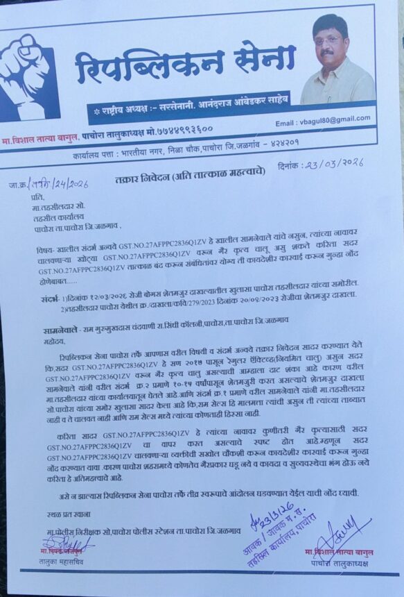 यावरून रिपब्लिकन सेना पाचोरा तालुका अध्यक्ष विशाल बागुल यांचे म्हणणे आहे की, राम गुरुमुगदास चांदवानी हे जर शेतमजूर आहे तर मग यांच्या नावाने 2017 पासून जीएसटी व भव्य शोरूम कुणाचे सदर जीएसटी वरून पाचोरा शहरांमध्ये गैर कृत्याचा प्रकार चालू असू शकतो आणि त्यामुळे कायदा सुव्यवस्था बिघडण्याची दाट शक्यता नाकारता येत नाही करिता सदर जीएसटी धारकाला शोधून त्यावर कायदेशीर कारवाई करून गुन्हे नोंद करण्यात यावे असे निवेदन पाचोरा तहसील चे नायब तहसीलदार मा . श्रीमती प्रतिभा राजपूत यांना देण्यात आले.