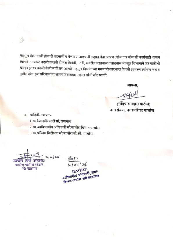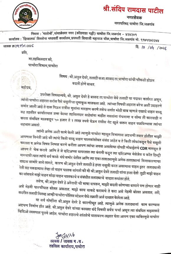 पाचोरा – बाळद.बु मधील तलाठी अतुल पाटील यांच्या नावाने अनेक सामाजिक कार्यकर्ते आरटीआय कार्यकर्ते व वाहतूकदार यांनी माननीय तहसीलदार पाचोरा येथे तक्रारी दाखल केलेल्या आहेत सदर तलाठी हे त्यांची सजा बाळद येथे कामावर असताना देखील पाचोरा शहर व आजू बाजूच्या परिसरात रात्री गस्तीवर फिरून वाळू वाहतूकदार यांना अडवुन आर्थिक लुबाडणूकीच्या हेतूने त्रास देऊन पैसे मागत असतात असे आरोप होत आहे हे वरिष्ठांच्या मर्जीनेच मलिदा मिल बाटकर खायेंगे या युक्तीने सदर तलाठी पाचोरा तालुक्यात काम करत असल्याचे बोलले जाते.यांचे अनेक प्रकार बाळद येथील ग्रामस्थांनी कथन केलेले आहे तसेच अनेकांनी आरटीआय अंतर्गत माहिती मिळविलेले आहे व अर्जही प्रलंबित आहेत सदर तलाठी यांची मोडस ऑफ ऑपरेडी ही मारा झोडा आणि राज्य करा अशीच दिसून येत आहे.