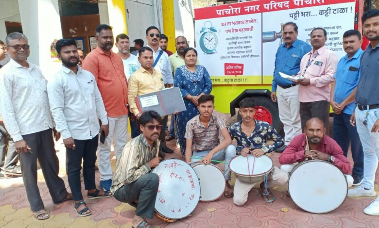 पाचोरा नगरपरिषदेतर्फे घरपट्टी / पाणीपट्टी, जागाभाडे / गाळाभाडे वसूली करीता धडक मोहीम वसूलीकरीता ढोल बजाओ पथकासोबत मुख्याधिकारी मैदानात